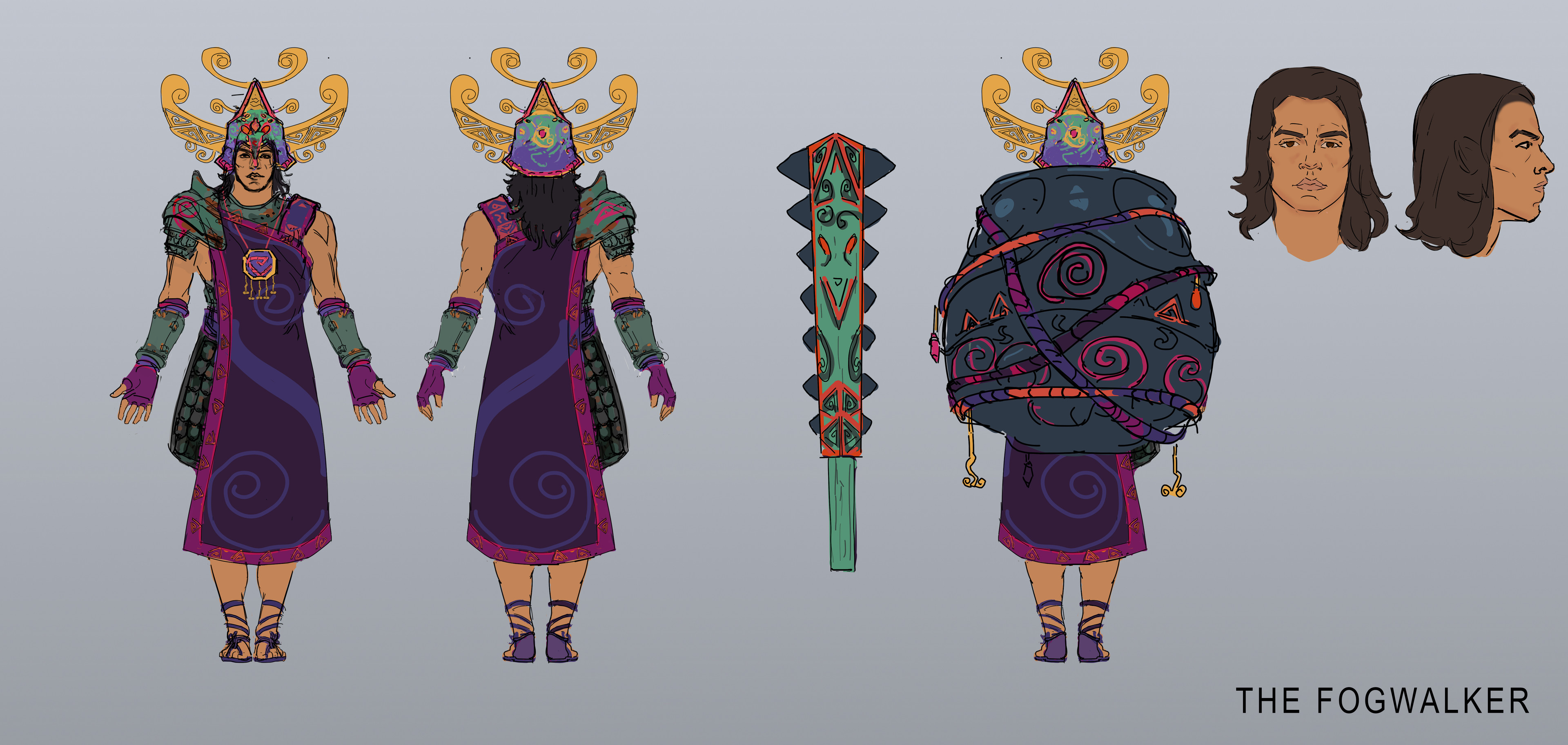 I Wanted to get the poison themes across in his character and was inspired by poison dart frogs in his colour scheme. I think it really helped to sell the poison idea better whilst still sticking to a bright colourful scheme you might associate with mesoamerican culture.